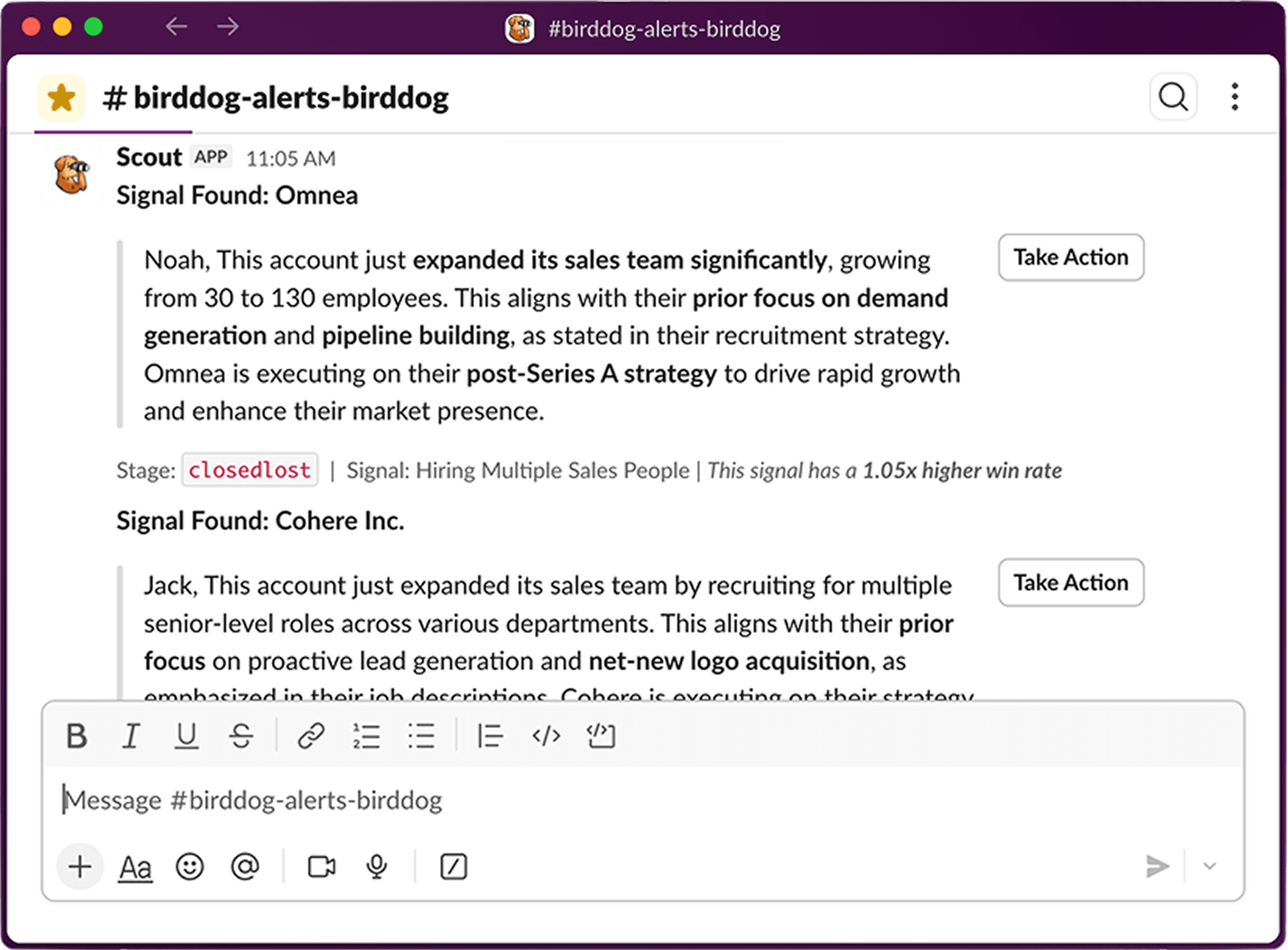 BirdDog finds and monitors accounts for signals that are unique just to your company, when it finds a match it pings you.